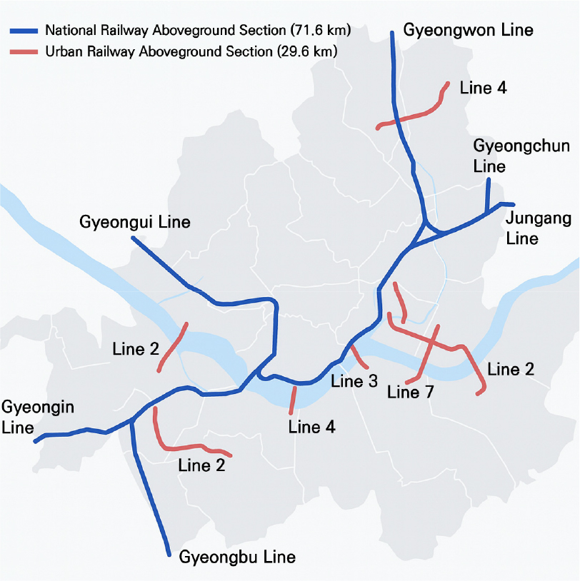 - In 2024, the Korean government enacted the Special Act on Railway Undergrounding and Integrated Development of Railway Sites to address spatial fragmentation and deterioration of surrounding areas caused by above-ground railways. This study takes this institutional shift as an opportunity to identify priority sections for railway undergrounding among seven above- ground railway lines in Seoul and to propose strategic development directions. In particular, by establishing a structured quantitative evaluation framework that incorporates key elements—redevelopment needs, public benefit, and development feasibility—this study seeks to overcome the limitations of prior case-specific evaluations. The analysis is based on three criteria: (1) redevelopment needs and suitability, (2) public benefit, and (3) development feasibility and implementability, and utilizes spatial indicators such as floor area ratio, building age, land price, land ownership structure, and infrastructure conditions. Results show that the Gyeongui–Jungang Line, with a high proportion of underdeveloped areas, aging buildings, and public land, is a strong candidate for leading projects that can leverage both policy intervention and private investment. In contrast, the Gyeongwon Line demonstrates strong public demand but relatively low feasibility compared to surrounding lines, indicating a need for strategic intervention to enhance its development value. This study contributes by presenting a comparative, quantitative evaluation framework that supports decision-making for railway undergrounding projects and offers practical guidance for strategies that balance public benefit and profitability.