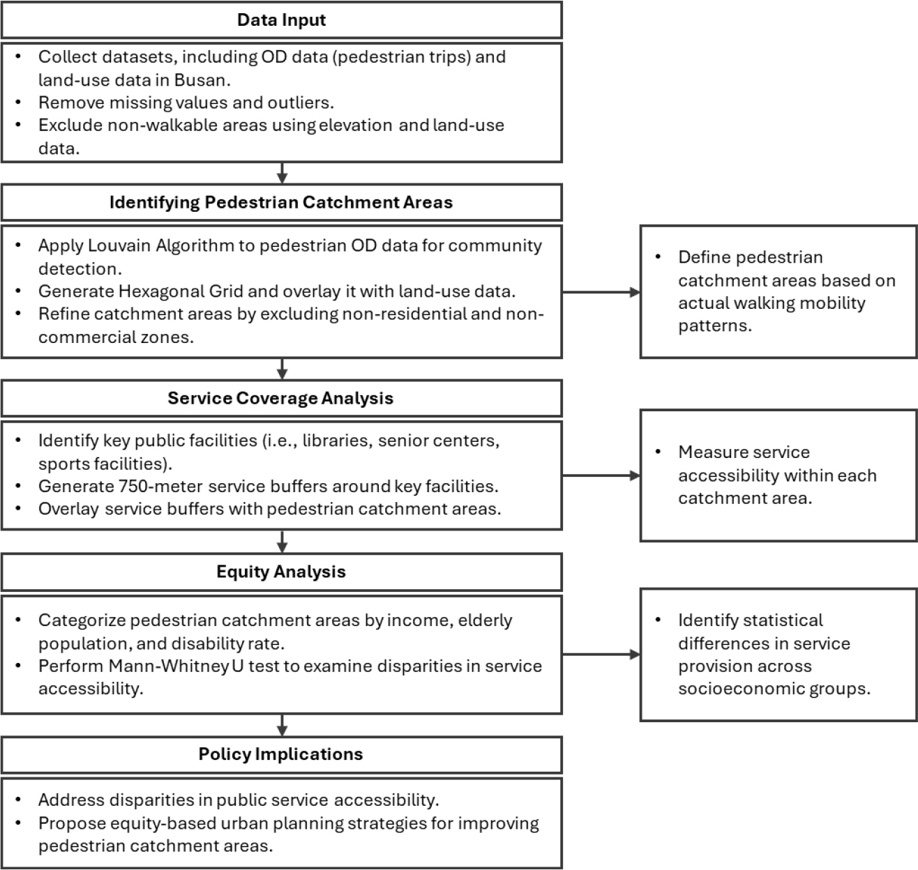 - This study presents a data-informed approach to delineate pedestrian catchment areas that better reflect actual pedestrian travel patterns. Pedestrian OD data from the Korea Transport Database (KTDB) for Busan were preprocessed and refined using land use and topographic information. Based on the refined spatial units, functional pedestrian catchment areas were identified through community detection using the Louvain algorithm. GIS-based accessibility to key public facilities, referred to as “anchor facilities” by the Busan Metropolitan City Government (e.g., senior centers, children’s facilities, and sports facilities), was evaluated. In addition, equity in service coverage was assessed based on socioeconomic characteristics such as income level, proportion of elderly residents, and proportion of residents with disabilities. The analysis identified 44 pedestrian catchment areas exhibiting distinct network configurations. Significant disparities in service accessibility were found for senior and children’s facilities in low-income areas and in areas with higher proportions of residents with disabilities. This study proposes a data-informed method for defining pedestrian catchment areas based on actual travel patterns. The findings also provide foundational evidence to support pedestrian- oriented urban and transport planning and to guide the equitable allocation of public facilities.