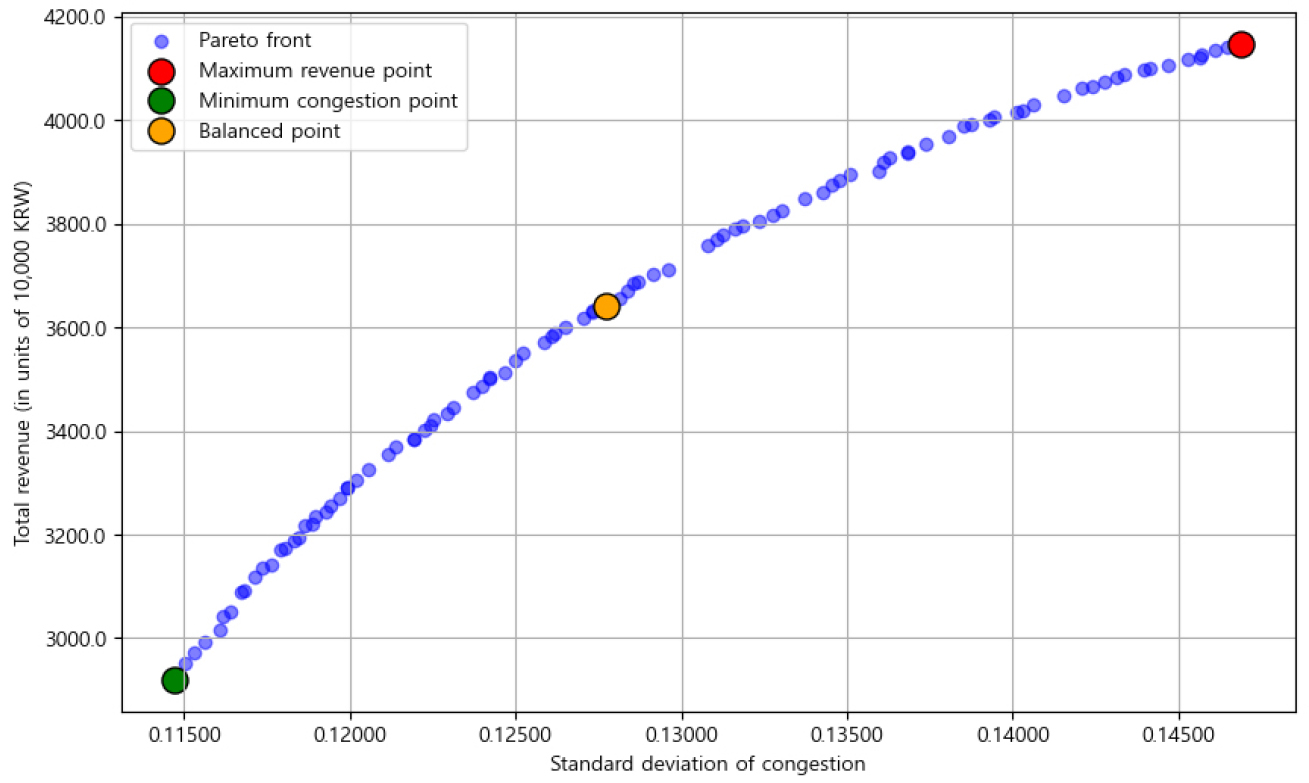 - The Seoul Subway is currently experiencing increased social costs and financial deficits due to severe congestion and an inefficient fare structure. In response, this study applies the Non-Dominated Sorting Genetic Algorithm II to determine optimal time-based fares for Seoul Subway Line 2. Non-Dominated Sorting Genetic Algorithm II is a multi-objective optimization technique capable of handling conflicting objectives simultaneously; here, it is used in conjunction with congestion data and fare elasticity to analyze how a variable fare system influences demand. The results show that introducing time-based variable fares can effectively redistribute passengers from congested to less congested periods, while also improving profitability compared to the existing fare system. Moreover, by examining the Pareto front, this study identifies several optimal solutions for the two competing objectives and conducts a detailed comparison of representative solutions that achieve a balance between congestion mitigation and revenue enhancement. These findings enable the proposal of concrete fare strategies that can be adopted when implementing a variable fare system. The significance of this research lies in demonstrating that a time-based variable fare strategy can simultaneously alleviate congestion and enhance financial stability, and it suggests the potential for expansion to other lines or different modes of transportation in the future.