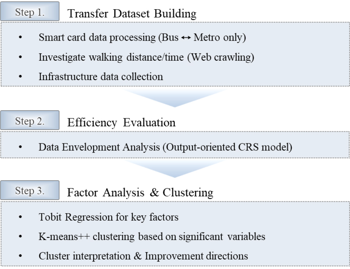 - As public transportation use grows in the Seoul metropolitan area, the transfer system has become more complex, increasing time, costs, and user discomfort due to inefficient routes and poor facility connectivity. In response, this study aims to evaluate the efficiency of subway transfer stations in the Seoul metropolitan area, considering intermodal connectivity, and propose improvement measures. Using smart card data, we derived transfer flows and average transfer times, and constructed a dataset of 105 transfer stations, including key variables representing the characteristics of each station. Data Envelopment Analysis (DEA) was employed to analyze the efficiency of transfer stations and revealed that some were efficient, but most showed inefficiencies. Key factors negatively affecting efficiency include station depth, escalator count, bus routes, and congestion. Additionally, stations were grouped through k-means++ clustering, and the characteristics and efficiency levels of each group were identified. Based on the characteristics of each group, the structural differences in efficiency were analyzed, and differentiated improvement directions were proposed. Through this, it was confirmed that improving the transfer environment is not merely a matter of resource allocation but requires an approach that considers user behavior. The results are expected to serve as an important basis for improving the efficiency of transit station operations and designing public transportation policies.